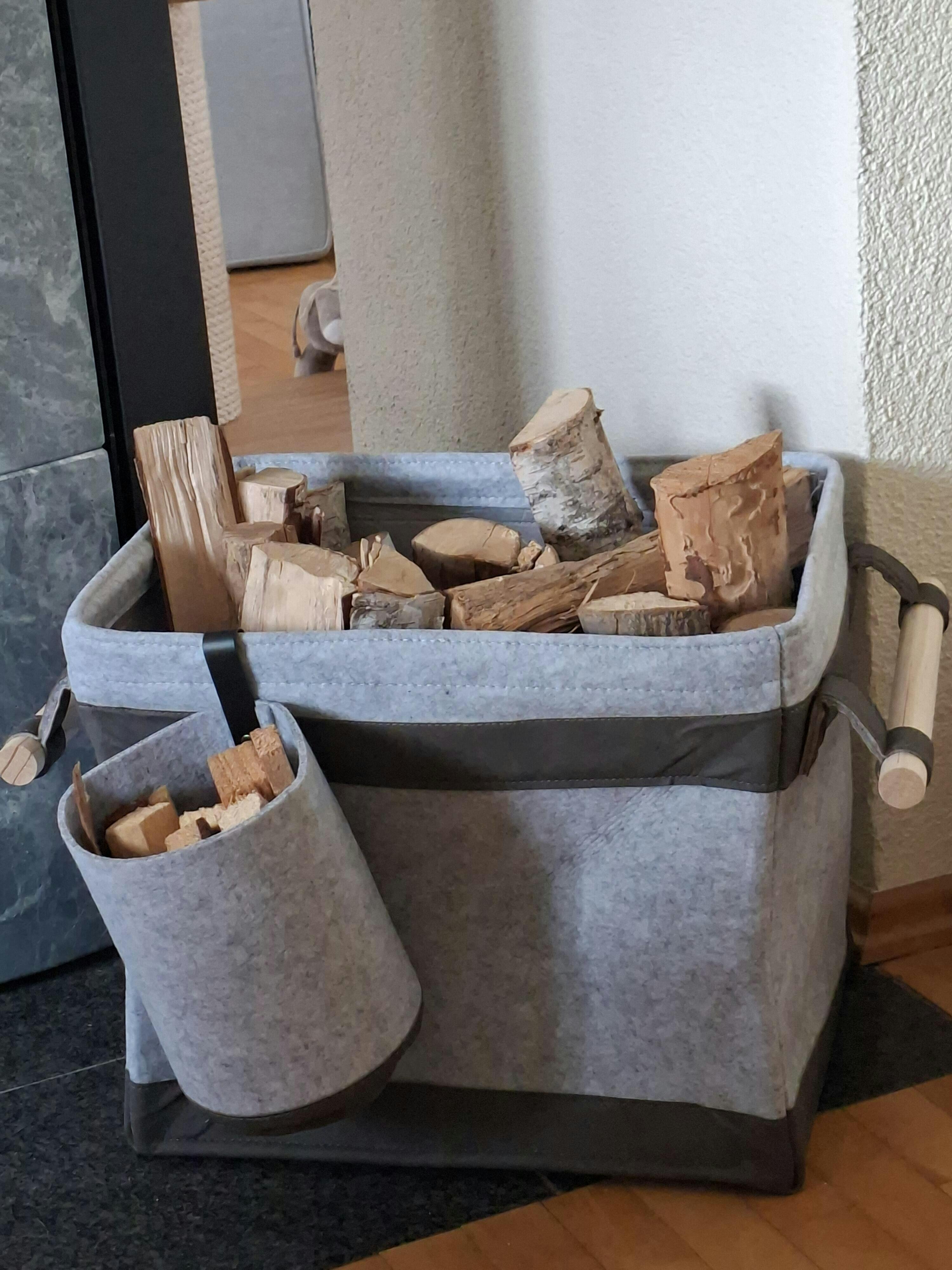 Je nach Scheitgröße passen in den Korb 15-20 Holzscheite. Genug um den Kamin den ganzen Tag anzuheizen.