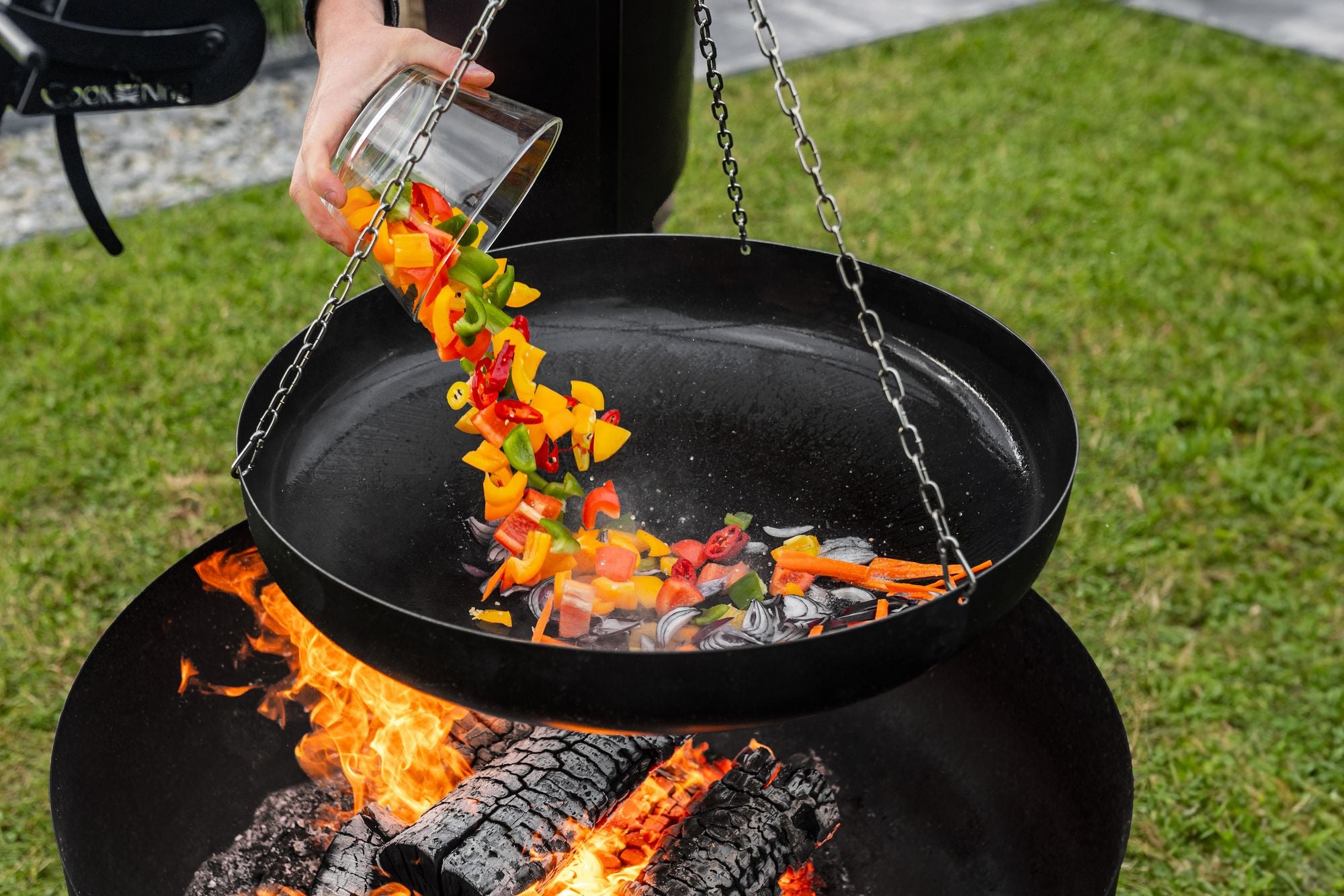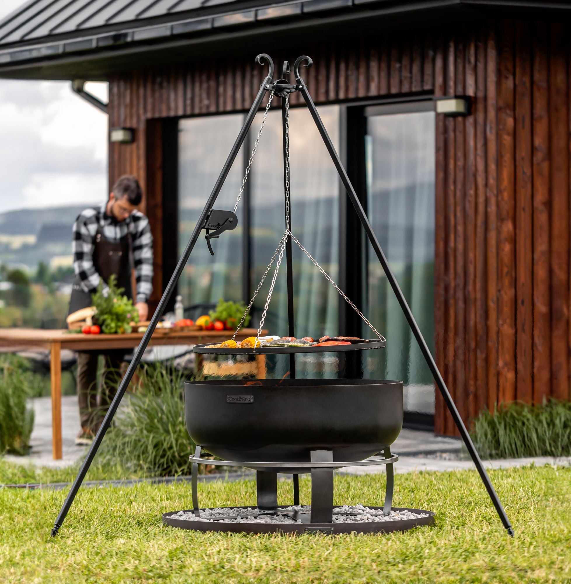Dank Dreibein und Aufhängung dreht sich der Grillrost 360° über der Glut – für gleichmäßige Hitze und einfaches Nachlegen von Holz. - Höhe nach Maß